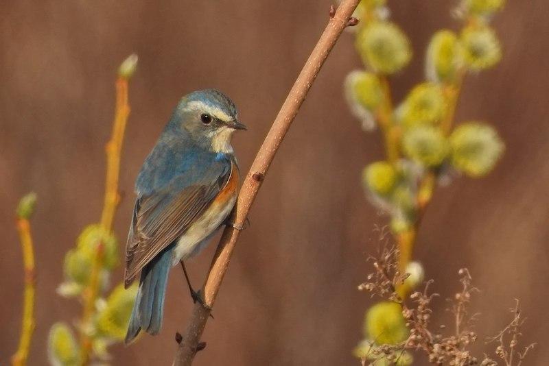 На пролёте можно увидеть очень интересных и красивых птичек. В марте-апреле у нас бывает на пролёте синехвостка, птица размером с воробья. Вполне соответствует своему названию — голова, верх тела и хвост голубовато-синие. Горло и брюхо белые, бока ярко-рыжие. Очень яркая и заметная птичка. Но вот видим мы её редко, хотя она и считается у нас обычной, гнездится в хвойных и хвойно-широколиственных лесах. Питается насекомыми. Весной, когда насекомых ещё маловато, птицы могут собирать мелких ракообразных на берегу моря или реки. Так что увидеть её можно и в этих местах.