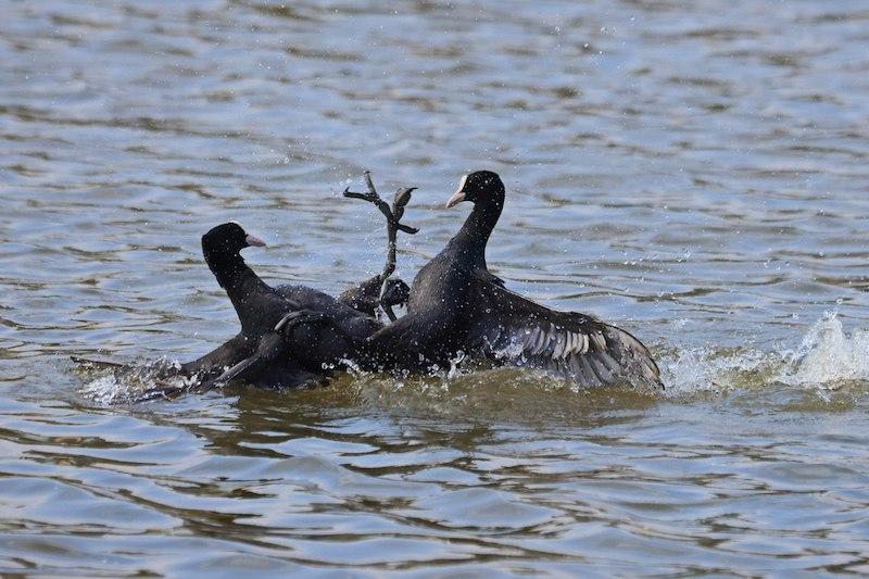 Утки в апреле всё чаще встречались парочками. Вот рядышком плавают селезень и уточка чирков-свистунков, а вот тихо «потьёкивает» парочка лысух. Лысухи, из отряда пастушковых, сплошь чёрного цвета, только короткий клюв и лобная бляшка белого цвета. Длинные ноги серого цвета, а на пальцах фестончатые плавательные лопасти. Они особенно заметны, когда утки стоят на камнях или, соперничая, сражаются друг с другом с помощью ног. Тогда их фестончатые лапы похожи на лапы дракона. Это можно увидеть на замечательных снимках фотографа-натуралиста Ольги Васик.