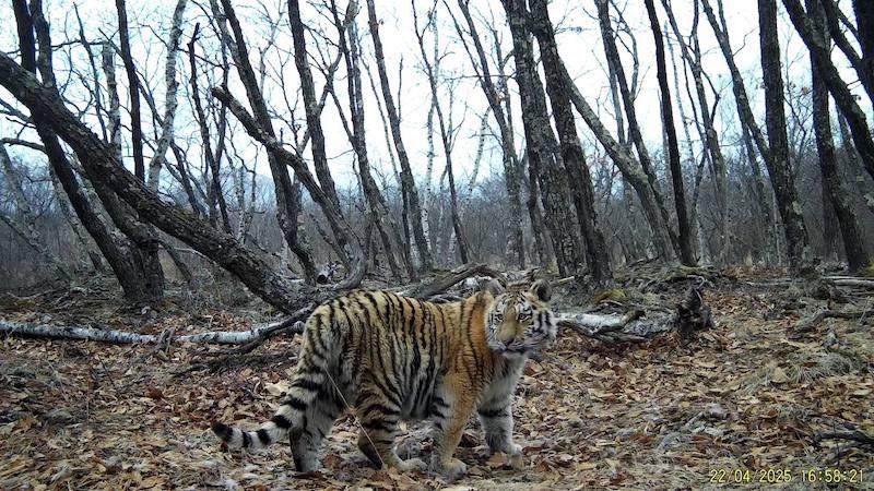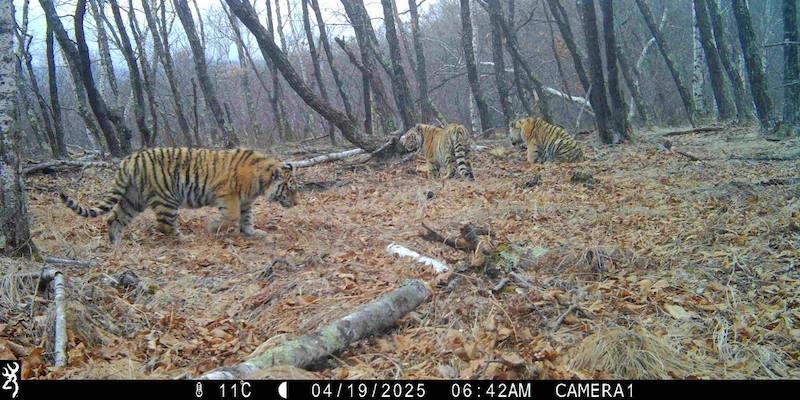 С начала апреля в заповеднике начаты мероприятия по спасению трёх 9-месячных тигрят, оставшихся без материнской опеки. Все мы знаем, что на территории заповедника между Пластуном и Тернеем обитала тигрица Северина, которая заняла этот участок с 2021 года. За это время она принесла два потомства. В первом был один тигрёнок Добрыня, который уже вырос и отделился от матери. Во втором выводке три тигрёнка, которым уже по девять месяцев. С конца февраля тигрица перестала фиксироваться фотоловушками, и с тех пор тигрята остались без матери. Сейчас за ними ведётся постоянный мониторинг с помощью фотоловушек и квадрокоптеров. Была организована подкормка в месте, где отмечались тигрята. Все три тигрёнка находятся под присмотром. Два из них держатся парой, а третий приходит отдельно, но все они регулярно отмечаются на фотоловушках и держатся на месте подкормки. В конце апреля все три тигрёнка зафиксированы фотоловушкой вместе. Они находятся в хорошей физической форме, регулярно посещают подкормочную площадку.