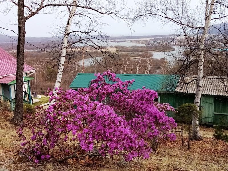 Наш рододендрон сихотинский в эту весну цвести не торопился. На южных склонах он зацвёл в середине третьей декады. А вот на сопках ближе к морю зацвёл он позже и не дружно. Было замечено, что цветочных почек на кустах маловато, поэтому цветки были редки. Вид этот является полулистопадным. То есть часть листьев опадает, но на молодых побегах вырастают новые светло-зелёные листочки. В эту весну зелёные листья росли в большом количестве одновременно с цветением. Ну, а повсеместного розово-лилового оттенка на склонах во время цветения в апреле не наблюдалось. Цветущие кусты хорошо просматривались лишь на фоне серых скал. Но впереди май, когда цветение рододендрона достигнет массовости.
