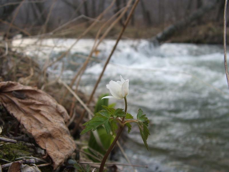 Зелёные краски в апреле появляются не сразу, постепенно. В пойме сначала среди сухой пожухлой прошлогодней травы и листьев появляются острые свёрнутые початки ярко-зелёных листьев чемерицы. Вслед за ней в середине апреля всходят крупные сизо-зелёные листья гусиного лука, который вскоре зацвёл. Выделяются своим ярким изумрудным цветом всходы ллойдии трёхцветковой, которая зацветает в начале мая. Вслед за гусиным луком дружно взошёл лук одноцветковый, образуя целые куртинки из нежных листиков. Они, кстати, съедобны и чем-то похожи по вкусу на черемшу, всходы которой появляются в начале апреля, а уже к концу месяца его листики развеваются высоко над землёй. Здесь же в пойме в третьей декаде повсеместно белели полянки ветреницы амурской, самой массовой в это время, наравне с чемерицей. Сообща, они создавали бело-зелёный аспект на фоне пожухлой прошлогодней листвы. Местами желтели головки селезёночника волосистого, начинала цвести калужница, голубела ещё кое-где хохлатка сомнительная. Появились всходы лабазника и водосборов.