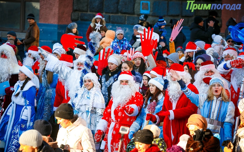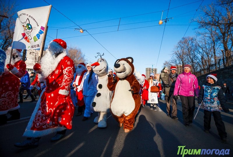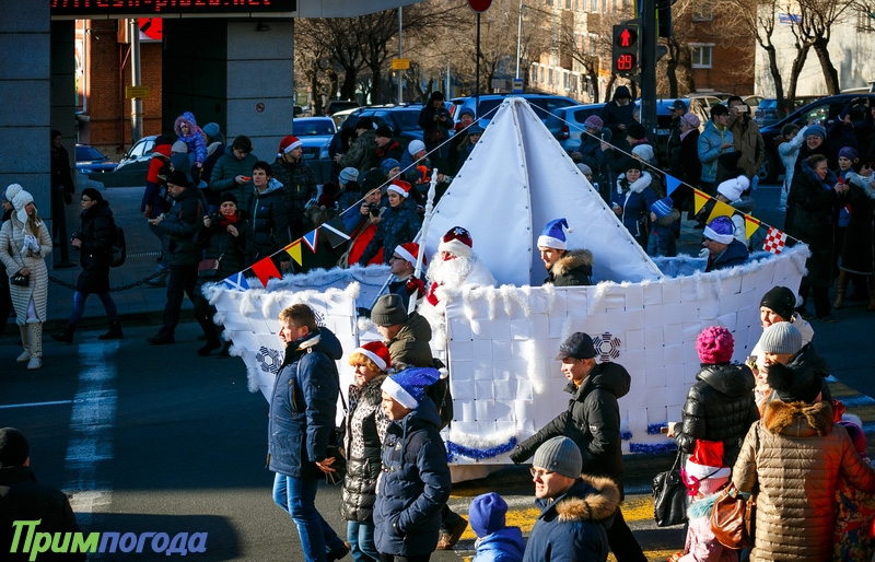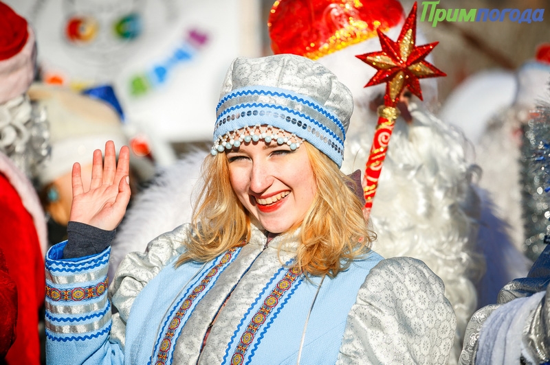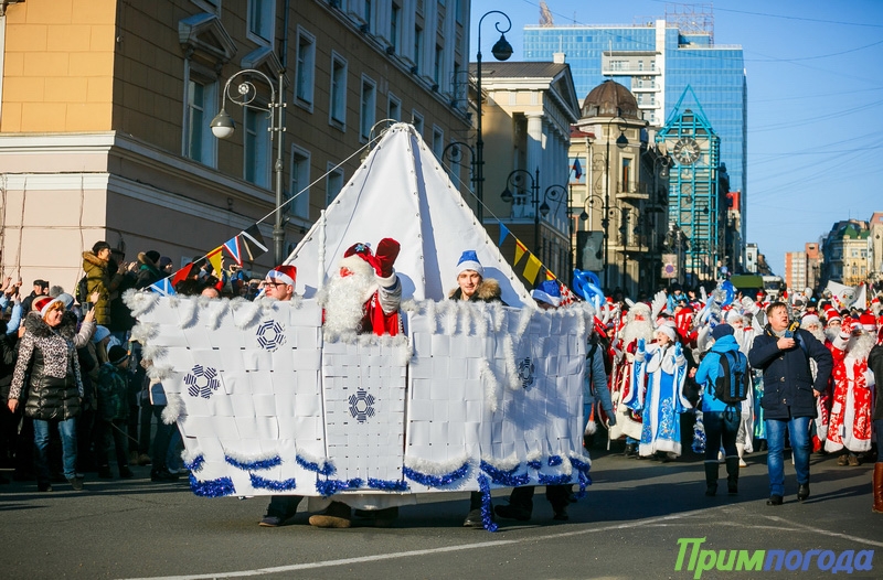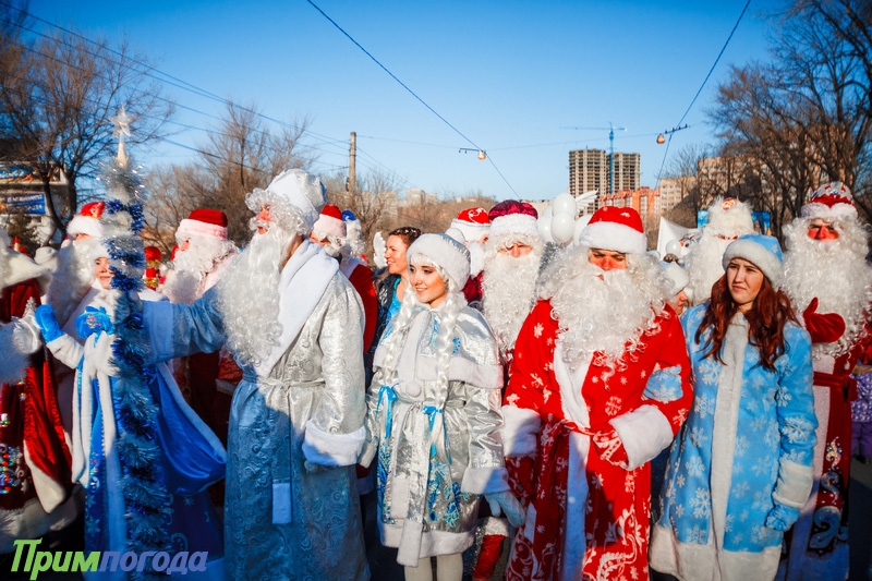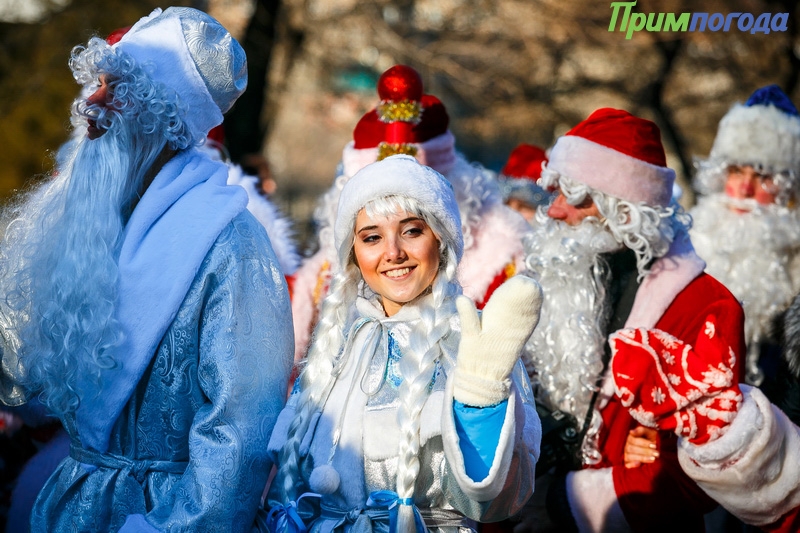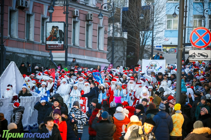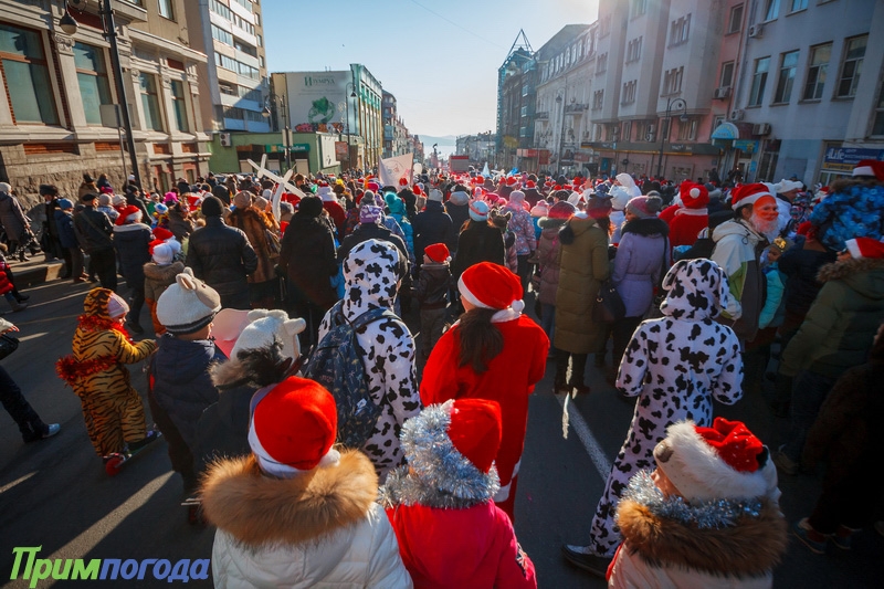 В субботу, 19 декабря, во Владивостоке впервые состоялось праздничное шествие Дедов Морозов. По Океанскому проспекту прошли порядка тысячи горожан и гостей города всех возрастов — Деды Морозы, Снегурочки, их сказочная свита и все желающие. Самых юных участников в костюмах Дедов Морозов родители везли в колясках.