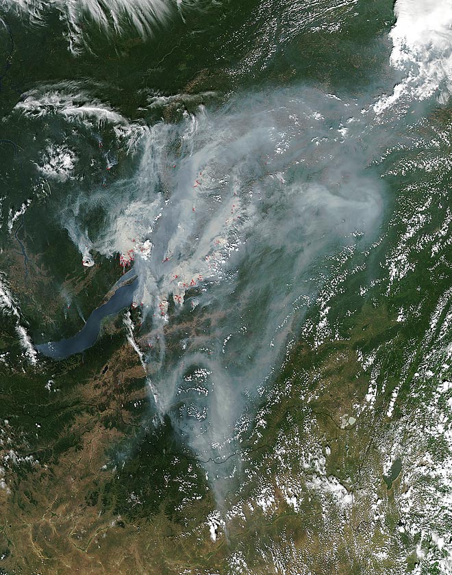 Фотографию горящих сибирских лесов спутник НАСА «Аква» сделал 8 августа. На изображении хорошо виден район озера Байкал, затянутый густым дымом от лесных пожаров.