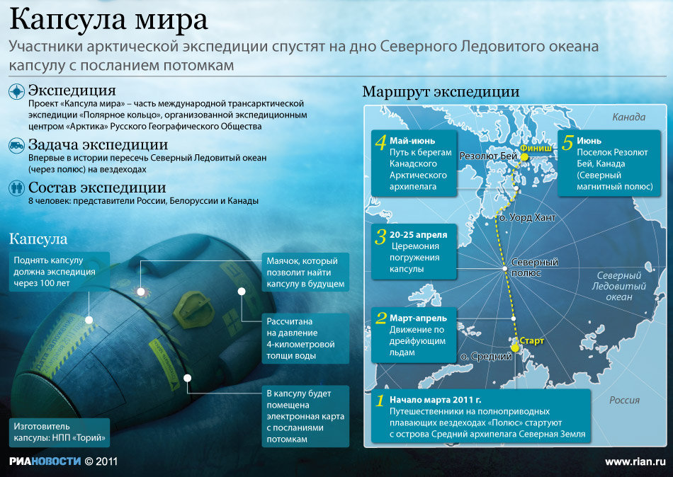 В ходе кругосветной экспедиции «Полярное кольцо» ее участники спустят на дно Северного Ледовитого океана специальную капсулу мира с посланием потомкам.