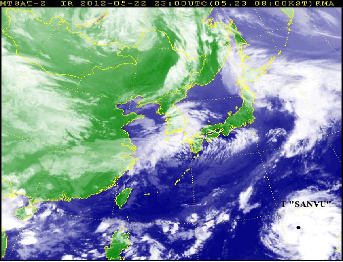 Вчера, 22 мая, на свет из тропической депрессии появился тайфун, второй по счету в этом году. Он получил имя «SANVU». Сегодня утром тропический вихрь находился в Филиппинском море, в районе с координатами 15.1 с.ш. и 141.8 в.д. Давление в центре составляет 998 гПа, максимальный ветер достигает 20 м/с, радиус сильного ветра (более 15 м/с) около 250 км.