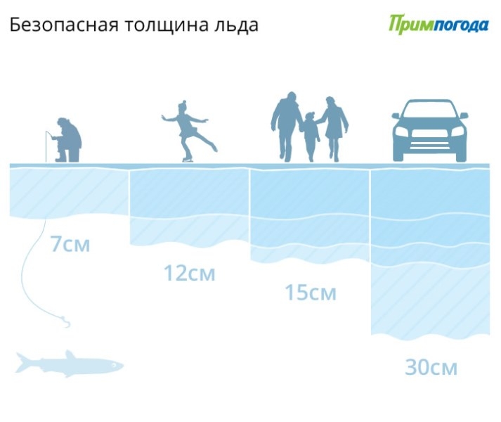 - Нельзя выезжать на лёд, толщина которого меньше 25–30 см, на машинах, особенно тяжелых. Опасно выезжать на неокрепший лёд в устьях рек, где под действием течений лёд неоднородный.