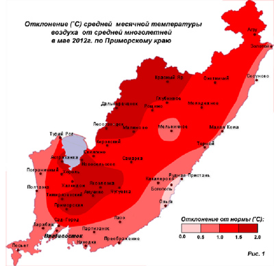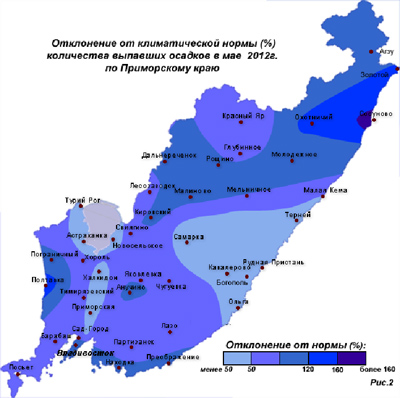 В мае выпало всего 30-65 мм (50-70%) осадков, местами ещë меньше 11-28 мм (20-48%), в северной части края в пределах нормы (80-120%) и только в п. Охотничий (Пожарский район) 98 мм (150%) и в районе п. Сосуново (Тернейский район) 160 мм (347%).
